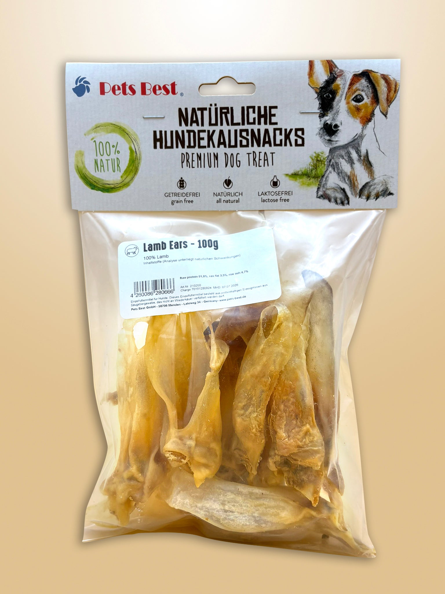 Dit product bestaat uit 100% lam, zonder toevoeging van granen, chemicaliën, conserveringsmiddelen of andere vulstoffen.